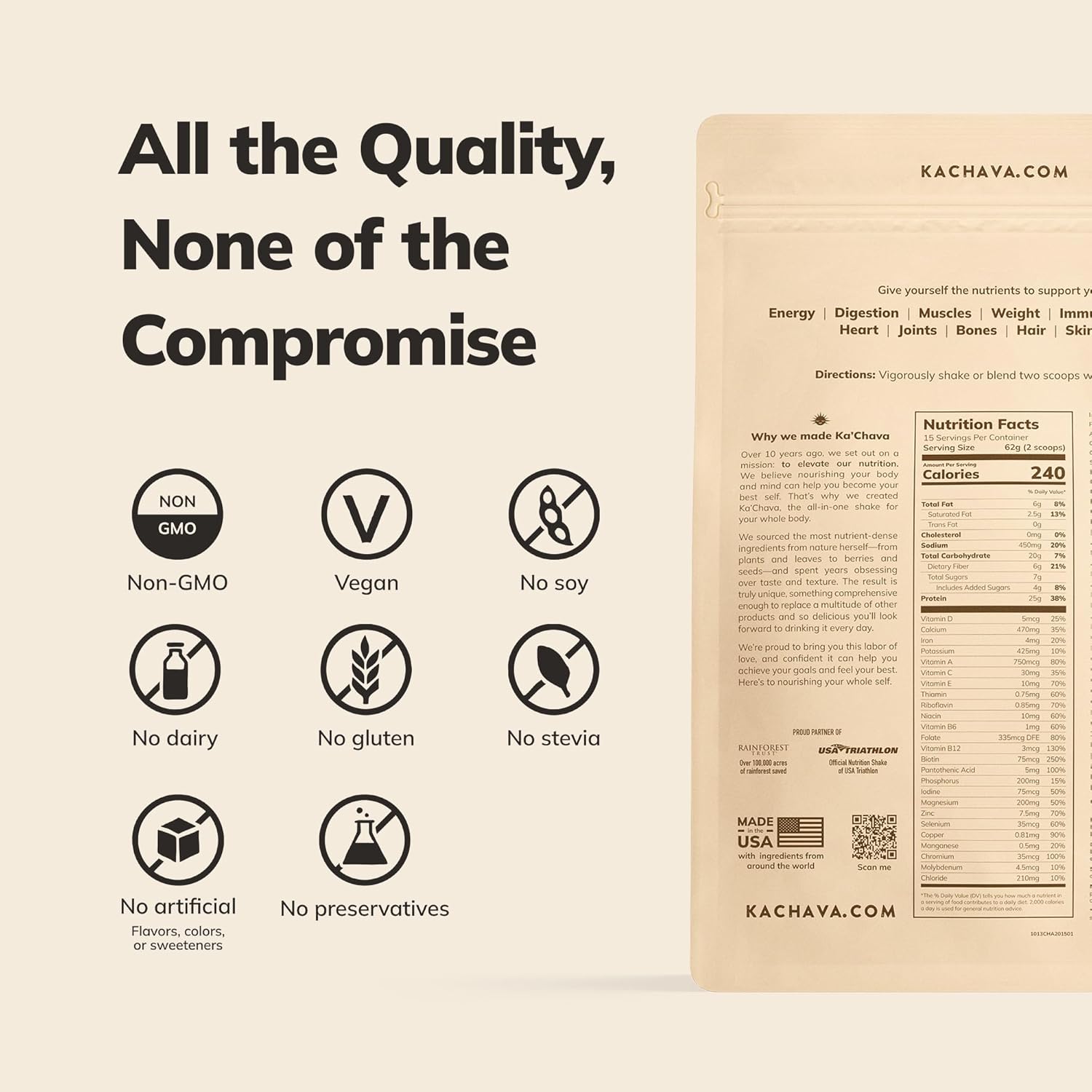 - FULL OF NUTRIENTS, NOT FILLERS: It's about what's inside – and what's not. Ka'Chava is non-GMO with no whey, no gluten, no soy, no dairy, and no artificial colors, flavors, or sweeteners. Just quality ingredients your body will love.